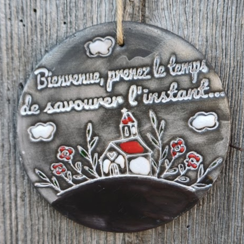 Cadre rond : "Bienvenue, prenez le temps de savourer l'instant".